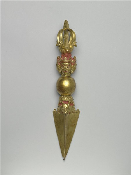 在驅邪儀式中,金剛鐝(普巴杵)是一重要的「武器」,將邪魔消除無蹤,故裝飾往往最猙獰。此件鐵鍍金的普巴杵,甚沉重,在五股杵的柄首蓮座下接三面的佛首,赤髮紅眉,耳戴活環,瞠目齜牙,表情凶惡。鐝端三稜立起而尖銳,有摩羯首銜之。此器似曾用過,尖端略折缺。