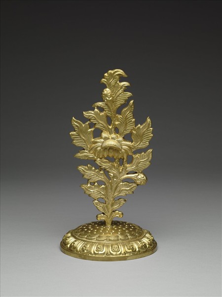 鍍金銅花,有盛開及含苞花各一朵,枝葉彎曲茂盛,整體造形自然生動。圓形底座仿蓮蓬造形,一顆顆蓮子清晰可見。其外緣鏨刻蓮瓣紋,為佛前供器。