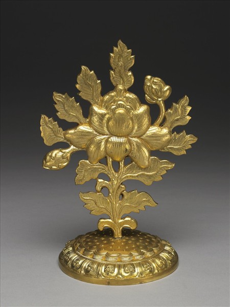 鍍金銅花,有盛開及含苞花各一朵,枝葉彎曲茂盛,向四方伸展。圓形底座仿蓮蓬造形,一顆顆蓮子清晰可見。其外緣鏨刻蓮瓣紋,為佛前供器。