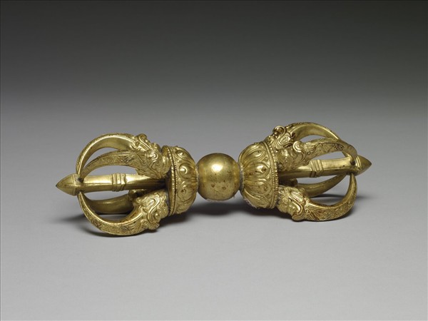 鍍金五股金剛杵,手執處為一光素無紋之圓球。兩金剛杵頂端尖銳,底端為一圈蓮瓣紋,蓮瓣上下各飾一圈圓珠,五股底端各為張口獸首,上有尖形蓮瓣。密宗佛教中,金剛杵象徵摧滅煩惱的菩提心,為諸尊之持物或修法的道具,能破除魔障。五股杵代表五智五佛。