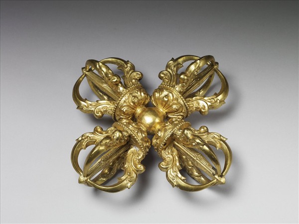 清宮作品,十八世紀。鍍金十字杵,錘鍱焊合,體甚輕。各杵均作五股式,銜咬的摩羯首塑如花葉狀,各紋理輪廓均圓潤,金色淺淡明亮,為典型的清宮金屬工藝。