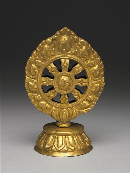 鍍金八輻法輪,其外環有寶珠火焰紋,器作圓輪形,輪心飾三道逗點式渦紋,象徵旋轉不息,輪下為俯蓮瓣紋底座。
