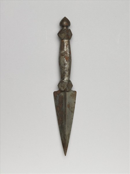 三稜式,上寬下削。柄身呈多角形,頂端為一花苞形鈕,周身光素無紋。