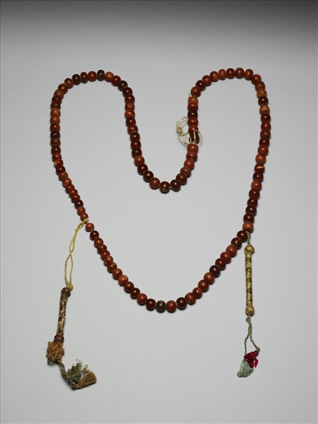 念珠,蜜臘質,色近暗紅,深淺不一。念珠,亦名數珠。