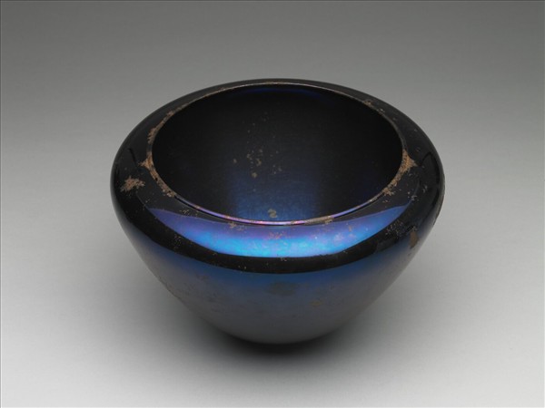斂口缽,底銳而圓,壁極薄,甚輕,通體靛藍色,表面已露多處鐵鏽。院藏此種鐵器鍍藍的技法,僅見於此種缽形器皿,似乎意起於仿青金石缽。附描漆皮盒,盒蓋內墨書漢、滿、蒙、藏文字,曰:「乾隆六十年(1795)八月二十八日,新造炕老鸛翎鐵缽一件。」
