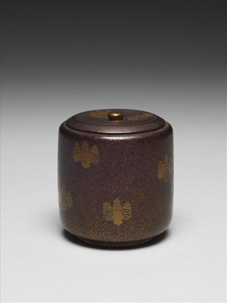 圓筒形漆盒,子母口,帶一圓鈕蓋。口緣外及盒身下緣呈圓弧狀,下端內收成足。器表以蒔繪為飾,濃梨地上飾平蒔繪菊花紋,內裝厭勝錢十枚。