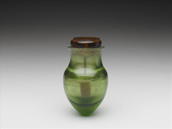 尖底玻璃瓶,寬頸斜肩圓腹,腹部下端呈尖錐形,附扁圓形蓋,整體造型與蟈蟈瓶有相近之處。附扁圓形琥珀色玻璃蓋,取模製葫蘆蟋蟀罐造型,院藏清丁觀鵬〈太平春市〉圖卷描繪京城新春市集展售童玩中,可見侈口厚沿,鼓腹帶蓋小瓶,可能屬蟋蟀罐容器類型。