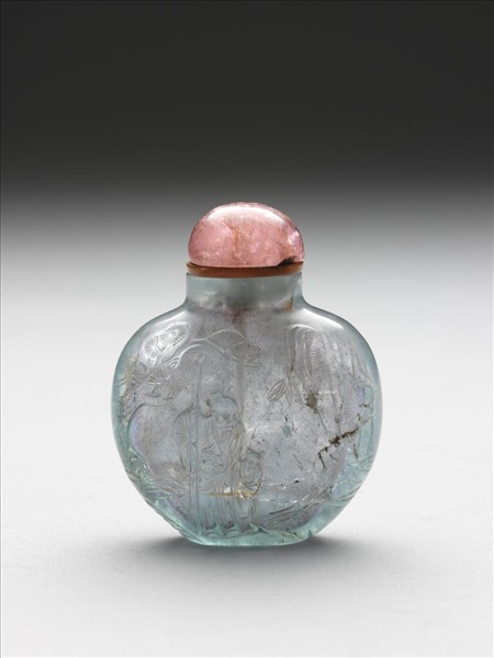 海藍寶雙面浮雕對弈圖及松下老者與童僕,帶粉色碧璽蓋及牙匙。