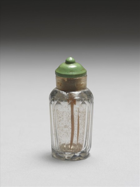 斜肩圓底玻璃小瓶,配綠色茜牙蓋。肩、腹及底緣呈稜面多角切割,器壁厚實。清雍正年間內務府造辦處檔案有收貯「洋玻璃磨楞鼻煙瓶」之記錄。此件玻璃小瓶可能屬此類來自西洋的稜面玻璃瓶。