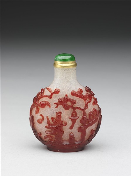 霏雪地扁瓶,瓶身套紅色玻璃刻仙人等。帶銅鍍金嵌翠玉蓋與牙匙。原貯於華滋堂燕喜堂中,共41個鼻煙壺貯於一楠木箱中。