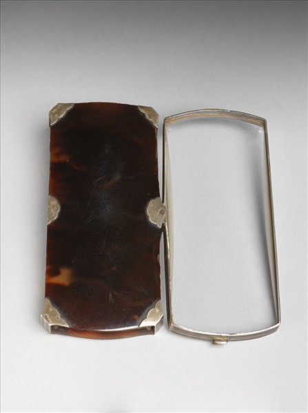 長方盒式放大鏡,盒面正背以玳瑁鑲金屬邊框構成,長方鏡面可自側面推出展開,造型簡約,開闔設計精良。根據清宮造辦處《活計檔》,乾隆十八年(1753)三月間,收入百什件的文物項目中,包括「銀玳瑁顯微鏡方元大小五件」。