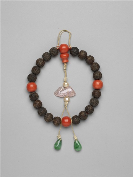 淺浮雕「囍」字茄楠木珠串成,間隔四個珊瑚珠為佛頭、佛頭塔下以真珠間隔雕粉色碧璽魚為背雲,翠玉墜角為飾。