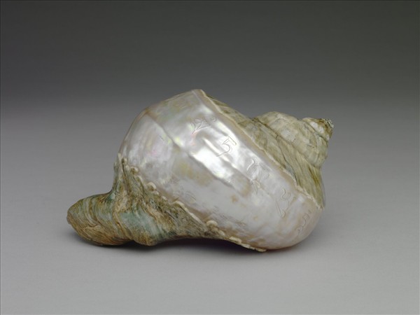 青螺,外部中段將螺殼剔去,表層露出具珠光之貝層,並淺刻梵文十四字,及「乾隆年製」四字雙行隸書體。餘青色螺殼,則雕如海波狀。附描漆皮盒,盒內墨書漢、滿、蒙、藏文:「利益花海螺一件」。