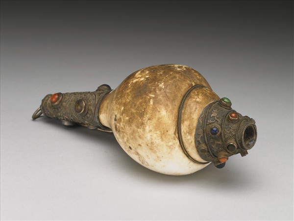 白色螺,形制左旋。口鑲鍍金邊,上端鑲鍍金頂,頂心一通孔為,以便吹奏,下方中心設一活環。鍍金邊及頂均鐫纏枝花葉紋圖案。上嵌各色石珠。螺類左右旋方向在中國傳統觀念中的定義與現代貝類學不同,故兩者之認定正好相反。