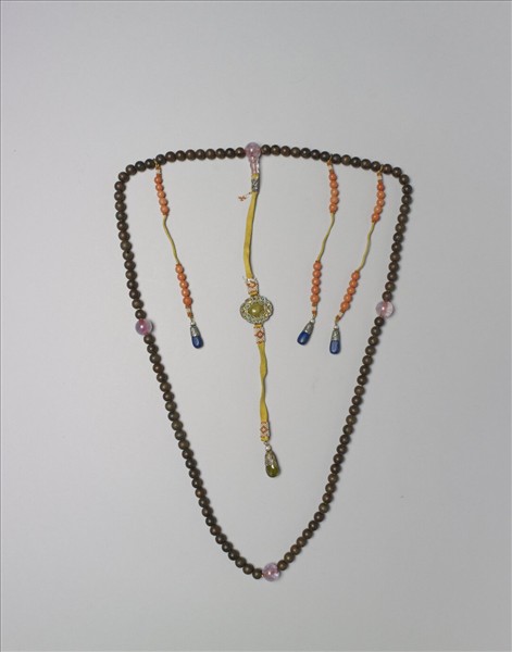 沉香木朝珠,計有沉香木珠一百零八粒,每隔二十七粒加入一粉紅碧璽珠佛頭,碧璽色淺而透亮,與木珠深褐的色調恰成對比。三條記捻都穿有珊瑚珠,下有深藍色碧璽墜角。佛頭塔以黃絲長帶連金屬背雲,背雲上嵌黃綠色碧璽,下接黃綠色碧璽墜角,黃綠色碧璽色調如黃金閃耀,為素質的木數珠增添富貴華麗之氣。以「朝珠」作為垂掛於胸前的飾物,是滿人特別的傳統,清高宗所欽定的《皇朝禮器圖式》中,便明確列出在各種祭典與各種身份的人,必須要使用什麼樣形式的朝珠,可知清代官方更將此項裝飾傳統視為定式。