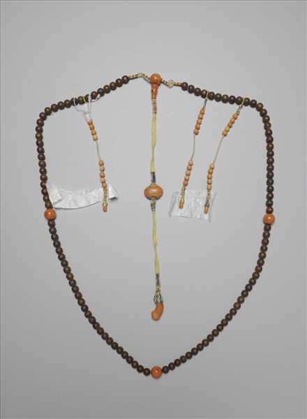 茄楠木朝珠,計有茄楠珠一百零八粒,每隔二十七粒加入一珊瑚珠佛頭。三條記捻都穿有珊瑚珠,下有珊瑚墜角。佛頭塔以黃絲長帶連金屬背雲,背雲、墜角皆為珊瑚質。以「朝珠」作為帝王大臣、命婦穿著朝服或吉服時垂掛於胸前的飾物,是清代特別的傳統,清高宗所欽定的《皇朝禮器圖式》中,便明確列出在各種祭典與不同身份的人,必須要使用特定形式的朝珠,可知清代官方更將此項裝飾傳統視為定式。