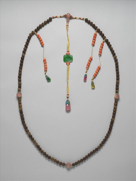 計有茄楠木珠一百零八粒,佛頭為雕團壽粉紅碧璽,與木珠間以綠松石相隔,佛頭塔以黃絲長帶連方形翠碧背雲與粉紅碧璽墜角。記捻穿有珊瑚珠,下有翠碧、粉與黃碧璽墜角。茄楠木珠表面,皆淺浮雕四「喜」字,與前件或為婚宴喜慶佩戴。