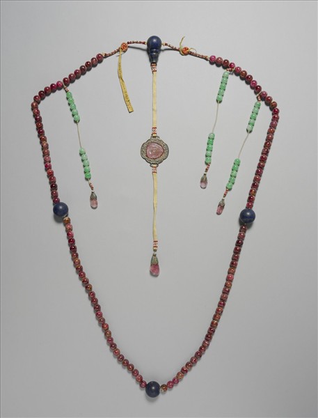紅碧璽朝珠,計有紅碧璽珠一百零八粒,每隔二十七粒加入一紫寶石珠佛頭。三條記捻都穿有碧玉珠,下有粉紅色碧璽墜角。紫寶石質佛頭塔下以黃絲長帶連金屬質背雲,背雲嵌粉紅色碧璽,下接碧璽墜角。以「朝珠」作為帝王大臣、命婦穿著朝服或吉服時垂掛於胸前的飾物,是清代特別的傳統,清高宗所欽定的《皇朝禮器圖式》中,便明確列出在各種祭典與不同身份的人,必須要使用特定形式的朝珠,可知清代官方更將此項裝飾傳統視為定式。
