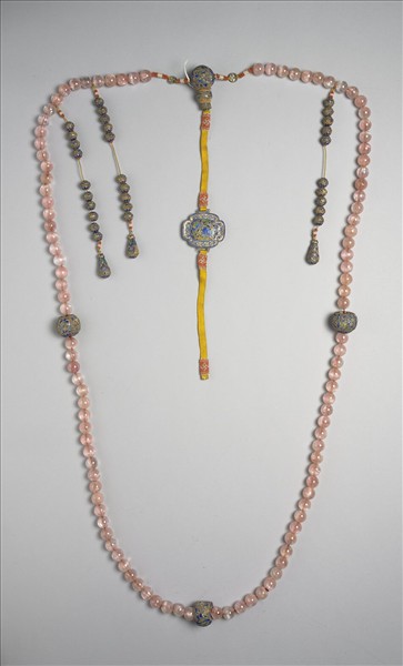 粉紅碧璽朝珠,計有粉紅碧璽珠一百零八粒,顆顆晶瑩透亮。除了做為主體的粉紅碧璽珠外,佛頭、記捻、墜角,都用金屬胎琺瑯製作、裝飾。這些金屬胎琺瑯,皆在金屬表面以金屬細絲盤繞出花鳥等圖樣,再施以藍色、綠色琺瑯釉,細緻的裝飾與亮眼的不透明色調,恰與透亮無紋的粉紅碧璽珠相映相襯。以「朝珠」作為帝王大臣、命婦穿著朝服或吉服時垂掛於胸前的飾物,是清代特別的傳統,清高宗所欽定的《皇朝禮器圖式》中,便明確列出在各種祭典與不同身份的人,必須要使用特定形式的朝珠,可知清代官方更將此項裝飾傳統視為定式。