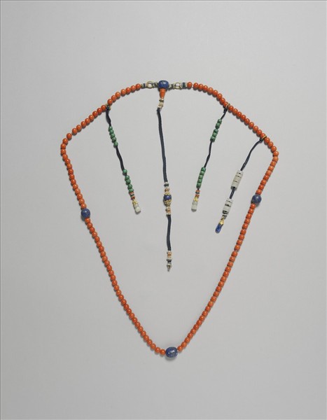 珊瑚朝珠,計有珊瑚珠一百零八粒,每隔二十七粒加入一青金石珠佛頭。有三串記捻,其二懸翠綠色碧璽珠,下有白玉墜角,另一則懸白玉短管,下接藍色碧璽為墜角。佛頭塔下以藍絲長帶繫青金石珠。由於珊瑚珠呈亮橘紅色,正與具有穩定藍色調的青金石珠佛頭相互映襯。以「朝珠」作為帝王大臣、命婦穿著朝服或吉服時垂掛於胸前的飾物,是清代特別的傳統,清高宗所欽定的《皇朝禮器圖式》中,便明確列出在各種祭典與不同身份的人,必須要使用特定形式的朝珠,可知清代官方更將此項裝飾傳統視為定式。
