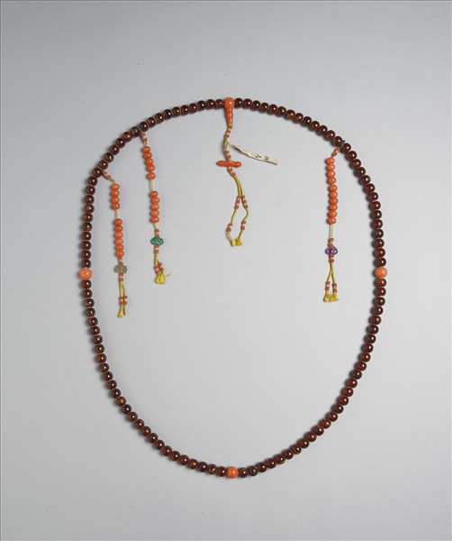 蜜臘念珠,計有蜜臘珠一百零八粒,每隔二十七粒加入一珊瑚珠佛頭,三串記捻都穿有粉紅色珊瑚珠,下各繫紫色、綠色小飾件為墜角。蜜臘色褐瑩潤,再配合珊瑚珠亮橘的鮮明色調,呈現出本器材質的華麗與貴重。附白籤,上書「聖祖」二字。