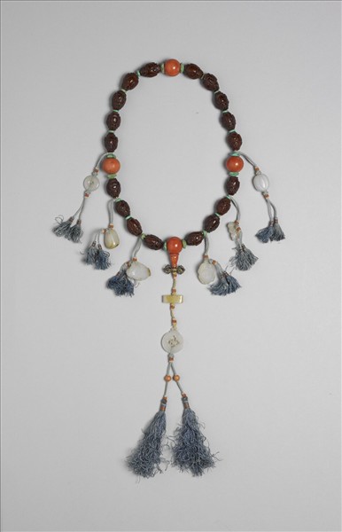 手串,以絲繩貫串木珠十八顆與珊瑚珠佛頭四顆而成。木珠隨形雕鏤陰線紋,刻劃出寬面大肚、笑容可掬的人物。六記捻分飾以青玉瓜、猴、蛙、壁、蓮蓬、及玉墜等,垂以藍色絲穗。首端飾珊瑚佛頭塔一,鍍金杵二,青玉璲一,雕白玉古錢一,下接二珊瑚珠與藍色絲穗。