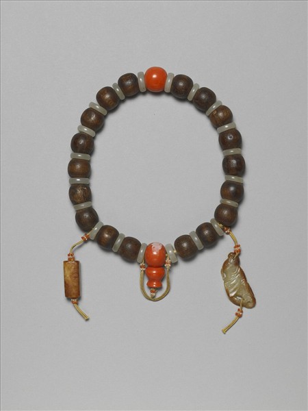 茄楠木手串,以絲繩貫串茄楠木珠十八顆與珊瑚珠佛頭二顆而成,珠與珠間隔以扁圓形玉片。手串上還繫有立體長方形與雕飾飛魚的飾件,玉飾件皆見近似舊沁之黃褐色。不論是玉色,或是珠與珠間的玉片,都為質樸的木質手串增添貴重,讓人更為珍惜。