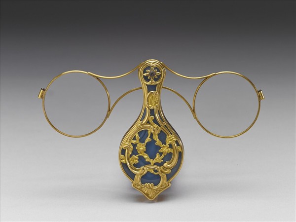 西洋製,可開闔,雙片式目鏡,瑪瑙鑲雕金花外框為柄,二片圓形透明玻璃鏡片可自兩側展開。金色鏤空紋飾具歐洲巴洛克式裝飾風格,線條迴旋律動且對稱呼應,整體設計精巧華美。