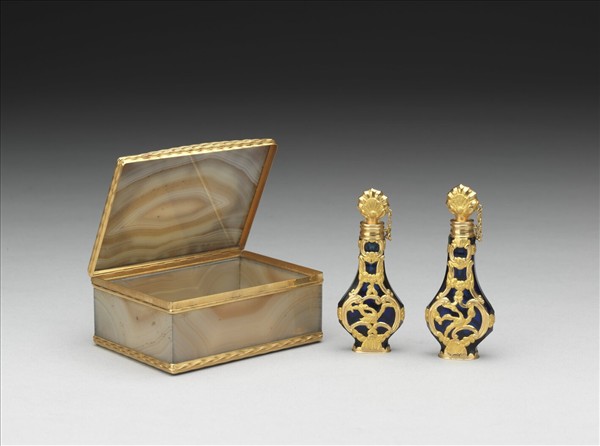 口袋式切割深藍色玻璃小瓶一對(故雜1041-1042),外鑲刻渦捲式花葉紋金框,口緣鑲金,有雕金貝殼花紋金屬栓蓋。小瓶盛裝於瑪瑙鼻煙盒中。