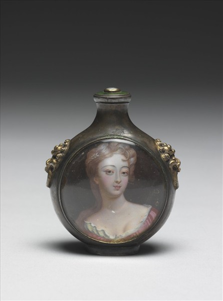扁壺形,一面鑲西洋仕女畫,外罩玻璃,另一面嵌尖晶石、藍寶石、剛玉等,圈足底嵌碧璽,兩側有獸首銜環。帶嵌珠、綠玉蓋與銀匙。