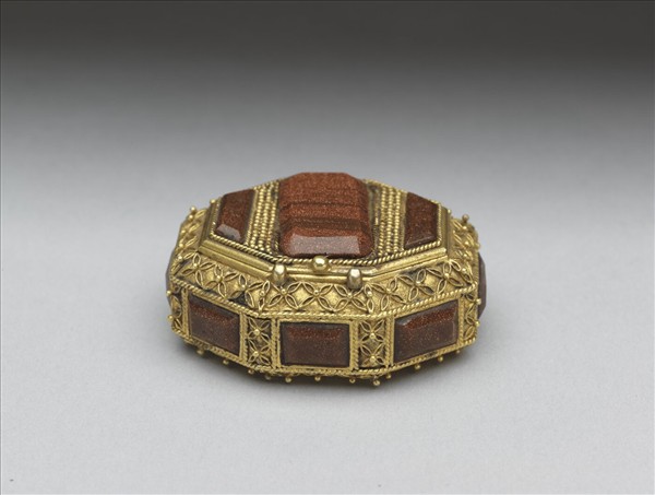 銅鍍金八方小盒,蓋頂及盒身周邊鏨刻圓珠紋、絞繩紋與花卉紋,並嵌金星玻璃長方片。玻璃底色在深棕與棕黃間略有差異,若干有深棕色紋理,星點微粒亦有銀灰及金色之不同。蓋內鏨刻花卉紋。此件貯存於〈瑾瑜匣〉紫檀百什長方盒中,著錄為「銅鍍金鑲金星玻璃八方盒」。