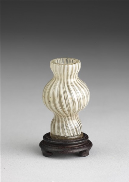 短頸鼓腹平底小瓶,以透明玻璃底胎結合粗細不同的管狀乳白玻璃(Lattimo glass),形成間隔排列,微具斜向展開的紋飾,屬威尼斯纏絲玻璃(filigrana glass)類型。此種技法於十六世紀由義大利威尼斯Murano地區玻璃工坊創發,將透明玻璃與寬窄相異,交疊或平行的乳白玻璃條紋作各類組合,產生細線編絞,旋轉纏繞的紋理。此件精巧的玻璃小瓶配有木座,收貯於清宮養心殿〈瑾瑜匣〉紫檀百什件提梁長方盒中,著錄為「纏絲玻璃瓶」。