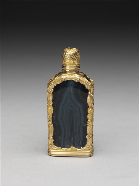 長方形瑪瑙扁瓶,邊緣鑲刻渦捲式花葉紋金框,有玻璃栓蓋,外有雕金花旋紐蓋。院藏有一式兩件。(故雜1086-1087)