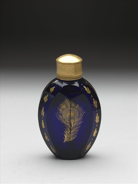 為西洋香水瓶形式,藍色透明切割玻璃瓶,器表描金花草紋。帶銅鍍金蓋與匙。可能是十九世紀英國製品。