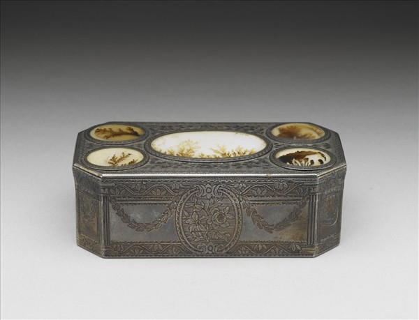 雕花長方掀蓋銀盒,蓋上雕花框嵌五個橢圓形草蕨瑪瑙,餘刻花卉,盒稜線刻古典柱為區隔,正反面雕橢圓框內有花束,底部橢圓框內為樂器,其餘點綴葉串。據盒內戳記可知此約為1778年倫敦製作。