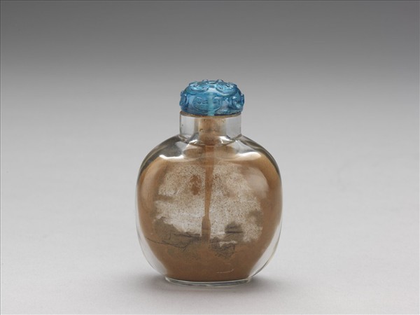 透明玻璃扁壺,帶雲紋淺藍色玻璃蓋與牙匙。