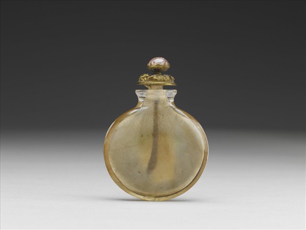 廣口,短頸削肩,壺身扁平形,矮圈足。帶粉色碧璽蓋頂。器身光素無紋,透明帶褐橘色皮聚於兩側。