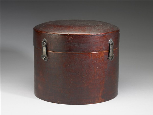 圓筒形皮製盒,器身呈黯紅色,蓋與器身以飾滿葉紋之蝶形金屬合葉相連,開口處則以兩側滑式鉤環扣合。蓋身表面飾對稱帶紋,由內而外分別為X形紋、渦漩形與回紋。盒身上部飾海棠花紋錦地,底部帶數周X形紋、渦漩形與回紋,紋飾細膩工整。盒內部裱飾有雲紋之紅色綾裡,中央黏附一張紙,由右至左書漢文、滿文與藏文三種字體,漢文為「利益鐵金玲瓏鉢盂」。
