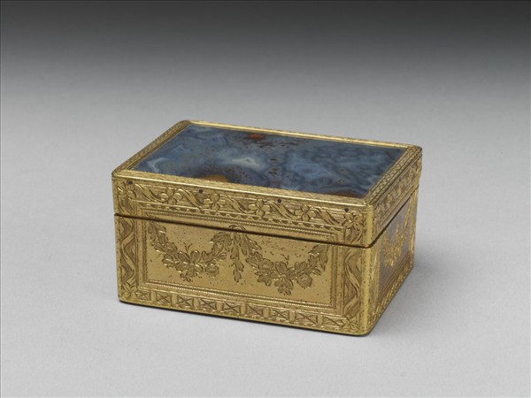 雕花長方掀蓋盒,蓋上嵌灰藍色瑪瑙,四面盒壁與盒底刻花邊,盒壁內雕花串。