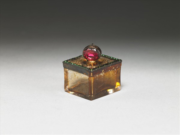 方形,帶圓餅鈕金屬蓋。蓋四邊嵌一周綠色料石,蓋頂淺浮雕花葉紋,蓋鈕嵌粉紅色料石。