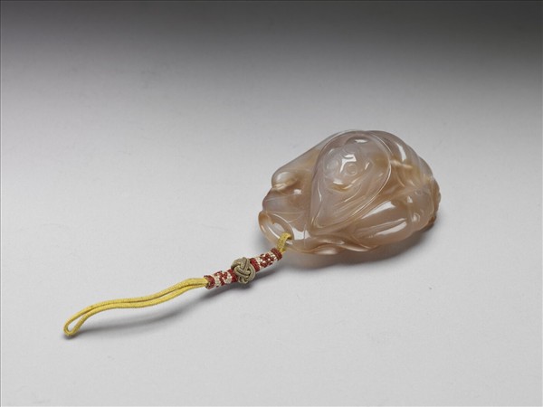 水滴形粉色瑪瑙,以立雕與浮雕技法雕一猴蜷臥於荷葉上,以陰線刻表現荷葉葉脈,頂端有一環,穿一黃色線帶,上飾鈕扣結與紅白色卍字編結。
