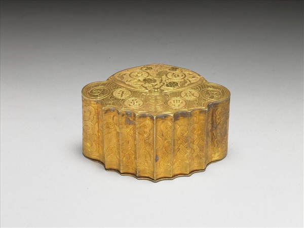 鍍金盒,以鏨刻搭配鍛敲製作圖紋,蓋面為蝙蝠抱桃,意寓福壽,桃上有「如」、「意」,蝠上有「咸」、「豐」、「萬」、「年」楷體陽文圓框字,盒形依蓋面彎曲成不規則狀,蓋側有珠紋錦地盤長、蝙蝠紋,上下飾回紋邊框,盒體光素無紋,內置黃緞包附之木座一只,中央挖空,存放一件瑪瑙猴。