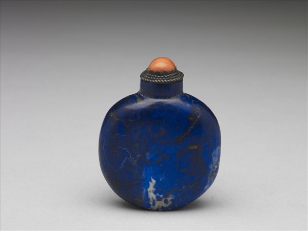 青金石鼻煙壺,直圓口,卵形扁腹,無足,壺身沁有白色及土黃色斑紋;銅蓋上雕有三圈繩紋,頂端嵌珊瑚,蓋內附一牙匙。