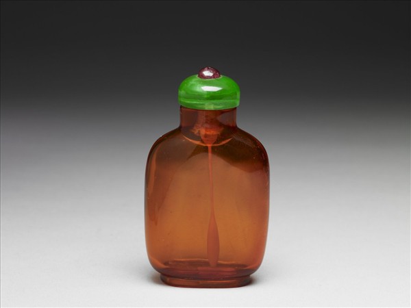 金紅色透明琥珀扁瓶,器壁薄,重量極輕。帶綠料嵌紅料石頂蓋與牙匙。
