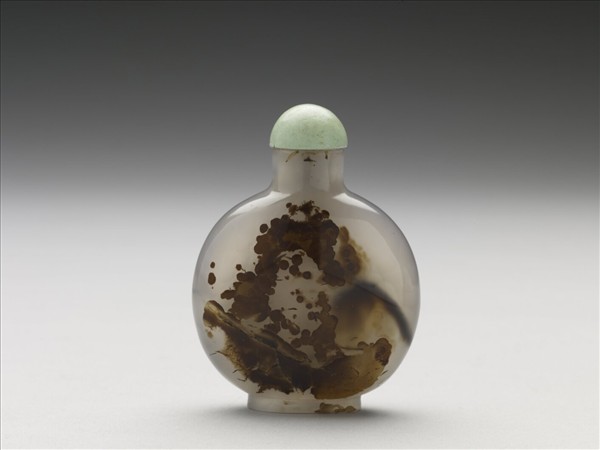 瑪瑙鼻煙壺,直圓口,器身扁平,圓腹,橢圓矮圈足微外侈;色灰白半透明,一面間有褐色斑紋,通體光素。帶綠松石蓋牙匙。