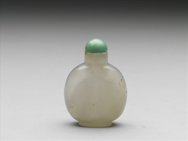 瑪瑙鼻煙壺,直圓口,削肩,卵形扁腹,橢圓形矮圈足;色灰白半透明,微沁褐色斑點,通體光素。帶綠松石蓋,缺匙。