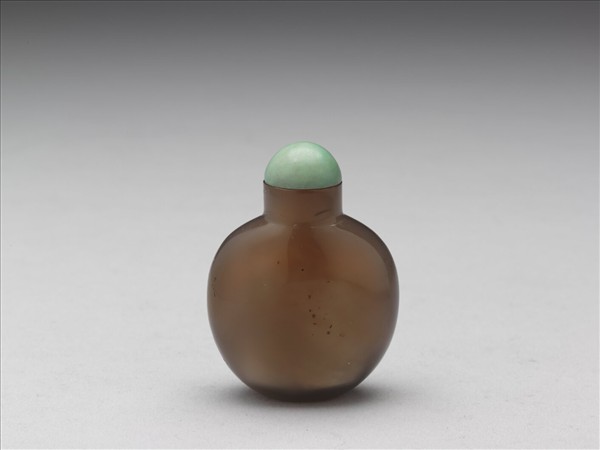 瑪瑙鼻煙壺,直圓口,削肩,壺身扁平,圓腹而無足;色呈淺褐半透明,通體光素,帶綠松石蓋,缺匙。