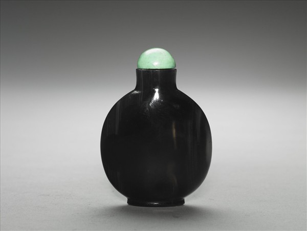 瑪瑙鼻煙壺,扁圓瓶式壺身,直圓口,斜肩,矮圈足;器身為黑色,沁有少許灰白色條紋,通體光素,帶綠松石蓋與牙匙。