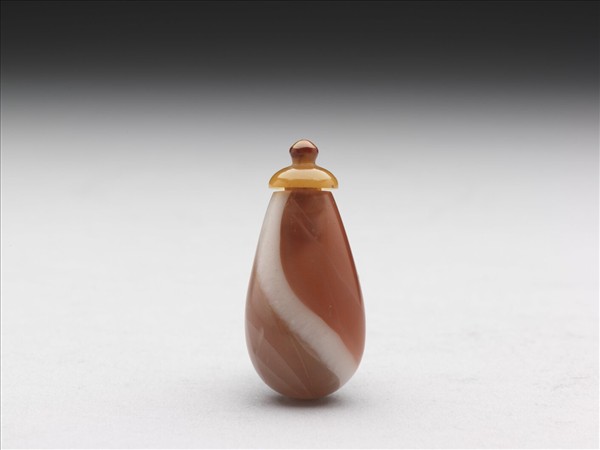 瑪瑙鼻煙壺,圓口,器身呈長梨形,矮圈足;色呈紅褐間沁有白色條紋,通體光素半透明。帶黃瑪瑙鈕蓋、缺匙。