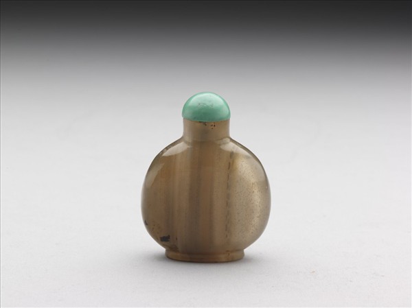 瑪瑙鼻煙壺,直圓口,斜肩,卵形扁腹,矮圈足外侈;色澤半透明沁灰褐條紋,整器光素。帶綠松石蓋與牙匙。